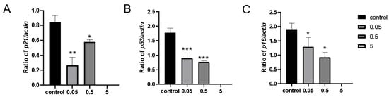 To investigate whether IDA treatment could extend the lifespan of prematurely aged zebrafish compared to the control group, we conducted a comprehensive qPCR analysis of senescence-related genes. The experiment aimed to assess changes in gene expression after seven days of IDA treatment. The results showed that genes p21, p16, and p53 were significantly downregulated after IDA treatment. At higher concentrations of IDA, the down-regulation was more pronounced. Specifically, at 5 mg/L, the expression levels of p21, p16, and p53 were reduced to undetectable levels (p < 0.001) (Figure 7).