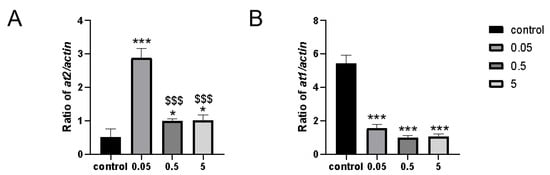 mRNA expression of senescence marker genes at1 and at2. (A) Expression changes of the at2 gene in zebrafish fed with a gradient for 7 days. (B) Expression changes of the at1 gene in zebrafish fed with a gradient for 7 days. Data are means ± SEM. Compared with the control group: * p < 0.05; *** p < 0.001; compared with the 0.05 mg/L group: $$$ <0.001.