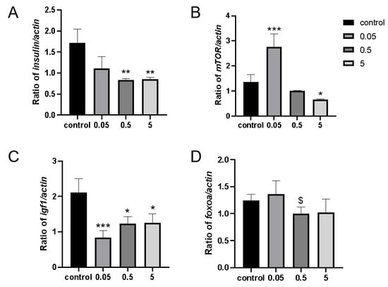 mRNA expression of genes insulin, mTOR, igf1, and foxoa. (A) Expression changes of insulin gene in zebrafish fed with gradient for 7 days. (B) Expression changes of mTOR gene in zebrafish fed with gradient for 7 days. (C) Expression changes of igf1 gene in zebrafish fed with gradient for 7 days. (D) Expression changes of foxoa gene in zebrafish fed with gradient for 7 days. Data are means ± SEM. Compare with the control group * p < 0.05; ** p < 0.01; *** p < 0.001. Compared with the 0.05 mg/L group: $ <0.005.