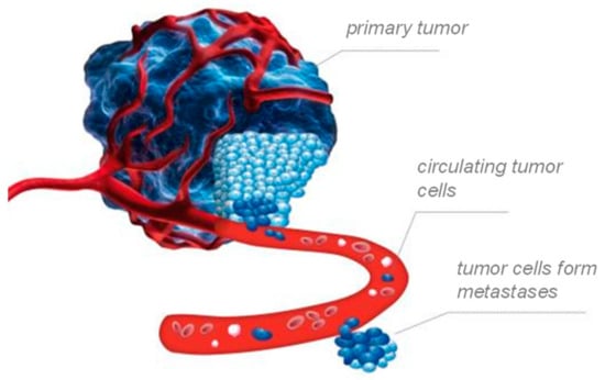 Circulating epithelial tumor cells (CETC/CTC) known to be shed by the primary tumor into the bloodstream can settle in distant loci and have been considered responsible for the development of disease recurrence and metastasis (Figure 1). They preserve the heterogeneity of the primary tumor and reflect its characteristics []. CETC/CTC as prognostic and predictive biomarkers have been widely studied for various entities []. In particular, CETC/CTC appear to have prognostic significance in the context of radiotherapy [,]. Real-time biopsy, which is non-invasive and has the potential to monitor treatment response, detect minimal residual disease and manage non-invasive therapy resistance []. Detection of CETC/CTC by liquid biopsy could contribute to more targeted patient selection to identify those patients who will benefit from individualized, targeted therapy [].