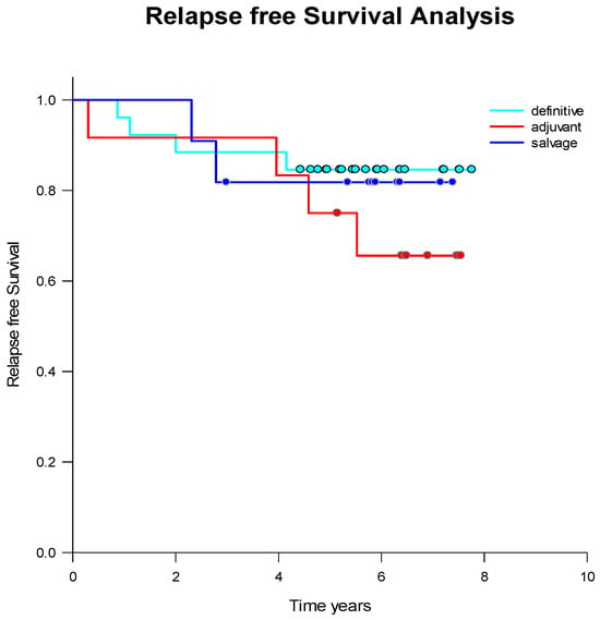 Relapses occurred 2–4 years after treatment completion in both definitive and salvage treatment groups, whereas most relapses in patients treated with adjuvant radiotherapy occurred 4–6 years after treatment.
