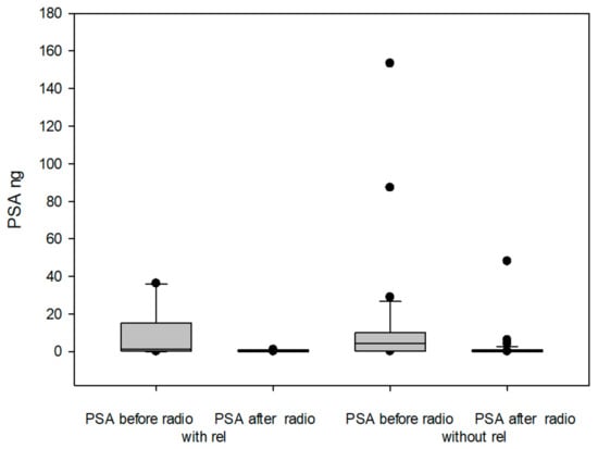This marker, however, has been shown to be controversial after radiotherapy [,]. While we observed a decrease in PSA levels during both adjuvant and definitive radiotherapy, there was no significant difference between patients who remained in complete remission and those who experienced relapse within the following six years. Thus, PSA levels did not serve as a reliable predictor of relapse.
