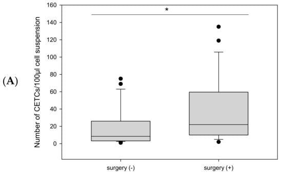 Patients who underwent radical prostatectomy had significantly more CETC/CTC than those who did not undergo surgery (median 22 vs. median 8.5; p = 0.018) (Figure 4A).