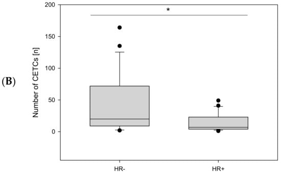 Furthermore, patients who received endocrine therapy prior to radiotherapy had significantly fewer CETC/CTC compared to those who did not receive endocrine therapy (median 7 vs. median 20; p = 0.03) (Figure 4B).