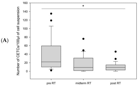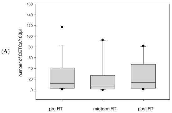 - Mäurer, M.; Pachmann, K.; Wendt, T.; Schott, D.; Wittig, A. Prospective Monitoring of Circulating Epithelial Tumor Cells (CETC) Reveals Changes in Gene Expression during Adjuvant Radiotherapy of Breast Cancer Patients. Curr. Oncol. 2021, 28, 3507–3524. [Google Scholar] [CrossRef] [PubMed]