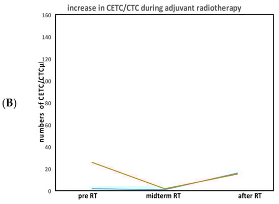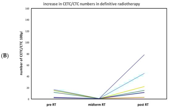 However, some patients—particularly in the adjuvant radiotherapy and definitive radiotherapy group—showed an increase in CETC/CTC numbers toward the end of treatment, often following a sharp decline at midtherapy. In contrast, during salvage radiotherapy, an increase in CETC/CTC was observed in only in one patient.