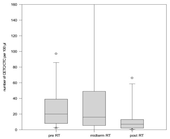 Boxplot diagram showing the mean number of CETC/CTC in patients undergoing salvage RT. The error bar for the midterm determination exceeds the scale. In order to keep the scales comparable, the scale was not expanded.