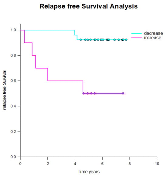 Statistical analysis was performed using SigmaPlot version 13.0 (Systat Software Inc., Chicago, IL, USA) for Windows. Comparisons between the variables were performed using Student’s t test (dichotomous variables) or ANOVA (for variables with more than two categories), with nonparametric tests applied where necessary. Correlations were analyzed using the Pearson or Spearman rank correlation coefficient. The Kaplan–Meier method, along with a log-rank test in SigmaPlot 13, was used to compare differences in relapse-free survival. A value of p < 0.05 was considered statistically significant.