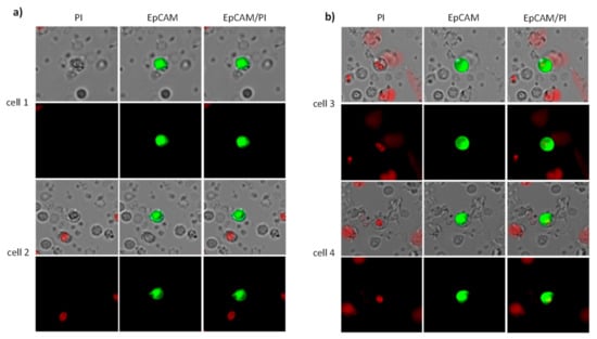 The analysis of additional biomarkers on the CETC/CTC like PD-L1, PSA, and PSMA, was performed using an extended maintrac® approach, as previously described []. Briefly, for PD-L1 analysis on CETC/CTC, we used an anti-human PD-L1 phycoerythrin (PE)-conjugated antibody (clone 29E.2A3, BioLegend, San Diego, CA, USA) at a final concentration of 0.2 µg/mL. For PSA analysis, an anti-human PSA PE-conjugated antibody (clone A67-B/E3, Santa Cruz Biotechnology, Dallas, TX, USA) was used, and for PSMA analysis, an anti-human PSMA PE-conjugated antibody (clone LNI-17, BioLegend, San Diego, CA, USA) was applied, both at a final concentration of 0.2 µg/mL. After staining, cells were visually inspected looking for green and red surface staining as well as a well-preserved nucleus (Figure 9). The results for staining with secondary antibodies were calculated as the percentage of the total number of CETC/CTC.