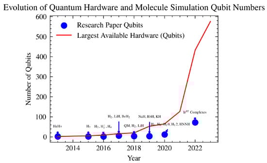 Progression of quantum computing technology from 2013 to 2023, highlighting two key trends: the rapid increase in the maximum number of qubits available in quantum hardware (shown in red) and the highest number of qubits used in significant quantum computing-based molecule simulation research papers each year (shown in blue). Each point in the research data series is labelled with the specific quantum system studied, providing insight into the scale of quantum experiments and their corresponding hardware capabilities over time. Due to the accumulation of noise, the size of the molecules studied is not increasing as rapidly as the advancements in hardware capacity [].