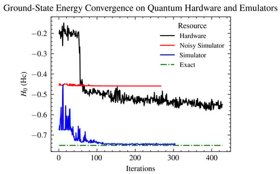 As illustrated in Figure 3, the noiseless simulator’s VQE run converges to the correct result in fewer than 150 iterations, demonstrating the potential efficacy of simulating quantum phenomena accurately. Conversely, the noisy simulator, incorporating the full spectrum of hardware noise reproduced for the same hardware, struggled to maintain a consistent energy minimization pattern. This challenge primarily stems from the absence of error mitigation techniques, which are crucial in counteracting the inherent noise present in quantum hardware. Furthermore, Figure 3 also highlights the impact of error mitigation in quantum computing simulations, where the hardware execution exhibits a marked convergence, characterized by a significant energy reduction within the first 100 iterations, followed by a more gradual decline. This underscores the importance of error mitigation in enhancing the accuracy and reliability of quantum simulations.