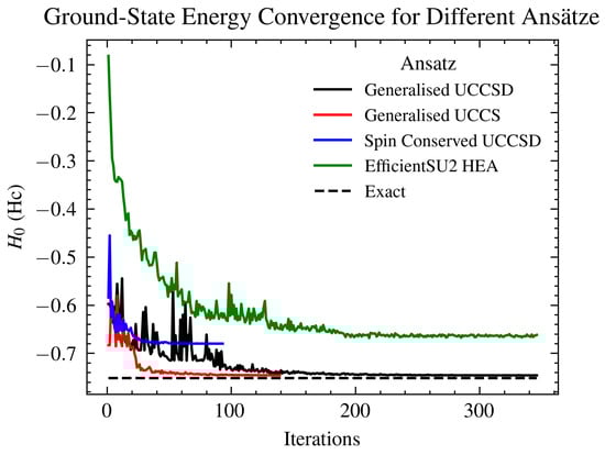 Choosing the most optimal ansatz for a VQE simulation is of great importance and can considerably change the final result. In Figure 5, we present a plot of the model Hc Hamiltonian ground-state energy estimation on an IBM simulator for different forms of the ansatz: generalized UCC-S/SD-type ansatz, spin conserving UCCSD ansatz, and hardware efficient ansatz, all compared to the exact value. As expected, the output of the simulation runs follows different convergences, which testifies to the strong sensitivity of VQE to the ansatz.