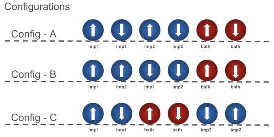 To evaluate the VQE method, one effective approach is to vary the mappings of the impurity and bath sites onto qubits. Given the known spin–spin correlations between impurities, it is expected that positioning their corresponding qubits further apart would lead to less accurate results. Figure 6 illustrates the three different configuration setups used in the experiments, with having the impurities’ qubits at the greatest distance from each other. The results, presented in Figure 12, confirm this hypothesis: the simulation converges more slowly to a higher estimate of the ground-state energy, primarily due to noise effects associated with entangling more distantly located qubits.