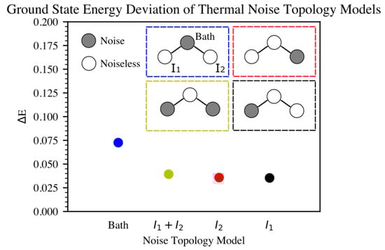Due to the size of the on-site bath energy, seen in Equation (5), compared to the impurities’ energies in Equations (6) and (7), it is expected that would not be strongly affected by the noise on the bath-site qubits. Taking into account Equation (4) and that would also not be affected by bath-site noise, we can conclude that we expect J’s reaction to bath noise to be dominated by the term. On the other hand, for noise on the impurities, Equations (13) and (16) show that competing effects from , , and are expected to reduce the overall noise. This effect is depicted in both Figure 8 and Figure 9, with noisy bath simulations clearly showing higher error levels for ground-state energy estimations compared to noisy impurity sites.