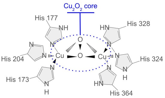 Hemocyanin (oxyHc) -bound form with an active site core labeled in blue (the center is a dication (charge not shown)).