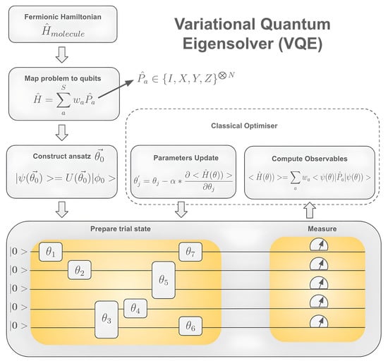 - Peruzzo, A.; McClean, J.; Shadbolt, P.; Yung, M.H.; Zhou, X.Q.; Love, P.J.; Aspuru-Guzik, A.; O’Brien, J.L. A variational eigenvalue solver on a photonic quantum processor. Nat. Commun. 2014, 5, 4213. [Google Scholar] [CrossRef] [PubMed]