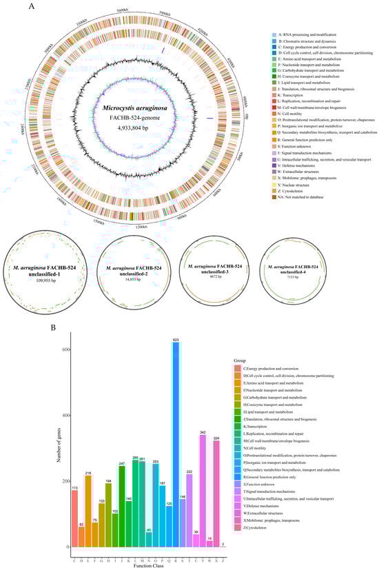 The current genomic sequencing results of M. aeruginosa FACHB-524 are not yet complete. To obtain the complete genome sequence of M. aeruginosa FACHB-524, we used nanopore sequencing and Illumina sequencing simultaneously. After filtering adapters, short fragments, and low-quality data, nanopore sequencing yielded 103,183 reads for a total of 982,441,195 bp of clean data for assembly, and 8,549,322 clean reads for a total of 1,276,206,792 bp of clean data were obtained by Illumina sequencing. The sequencing depth was ≥100×, indicating that the assembly result had good integrity. The complete genome sequence of M. aeruginosa FACHB-524 was determined from the assembly results (Table 1), which consists of a circular chromosome of 4,933,804 bp and four circular plasmids, with sizes of 109,955 bp, 14,853 bp, 8672 bp, and 7153 bp, respectively (Figure 1). The circular chromosome is named M. aeruginosa FACHB-524-genome, and the four plasmids are designated M. aeruginosa FACHB-524 unclassified-1/2/3/4. The complete genome sequence contains a total of 5071 genes. The M. aeruginosa FACHB-524-genome includes 4828 protein-coding genes, 4 rRNA operons, and 41 tRNA genes, with a GC content of 42.49%. The plasmids M. aeruginosa FACHB-524 unclassified-1/2/3/4 contain 138, 19, 10, and 8 protein-coding genes, with GC contents of 42.96%, 40.85%, 43.20%, and 44.65%, respectively (Table 1).