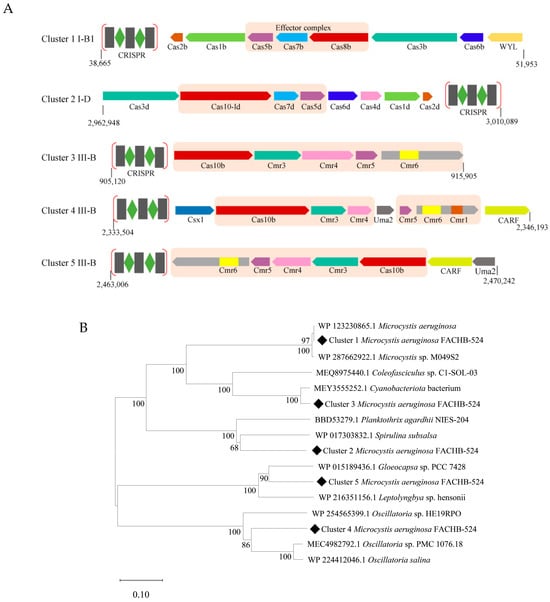 The CRISPR-Cas systems in the genome of M. aeruginosa FACHB-524. (A) Schematic diagram of the CRISPR-Cas systems. The Cas genes or accessory genes were indicated by arrows with homologous genes highlighted in the same color and that constitutes Cmr-α effector complex was labeled by light orange color box. The numbers indicate the CRISPR-Cas loci in the genome. (B) Phylogenetic analysis of Cas10 homologues in M. aeruginosa FACHB-524. The phylogenetic tree was constructed by neighbor-joining method with 1000 bootstraps.