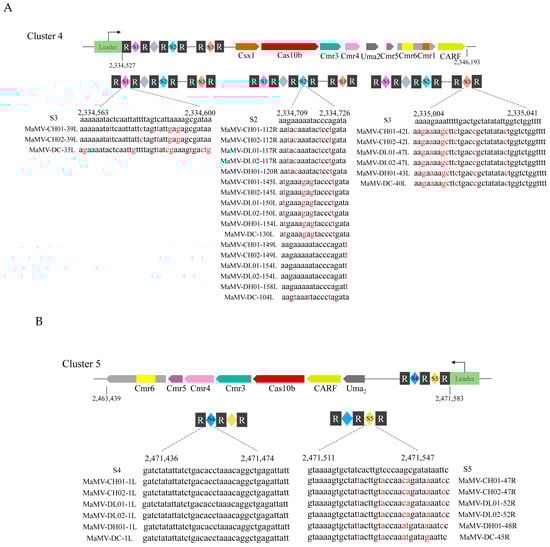 Targeting of M. aeruginosa FACHB-524 CRISPR system with genome sequences of MaMVs. (A) Sequences in Cluster 4 that target the MaMV genes. (B) Sequences in Cluster 5 that target the MaMV genes. The red highlighted bases indicate the bases in the spacer sequences differ from the genomes of the six MaMVs.