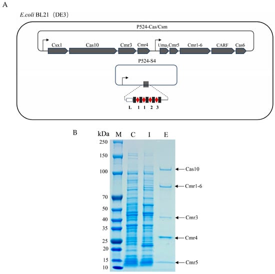 The plasmids P-524Cas/Cmr and P-524S4 were sequentially transferred into E. coli BL21 (DE3). The positive colonies containing the two plasmids were screened out by PCR detection and cultured in LB liquid medium containing the corresponding antibiotics at 37 °C overnight. On the next day, the bacteria were inoculated into fresh medium at a ratio of 1:100, and incubated with shaking until OD600 = 0.6–0.8. Then, IPTG (isopropyl-β-D-thiogalactopyranoside) was added to the medium at a final concentration of 0.3 mM, and induced at 20 °C for 18 h. The bacteria were collected by centrifugation at 5000 g for 10 min, and suspended in binding buffer (50 mM NaH2PO4, 300 mM NaCl, 10 mM imidazole, pH = 8.0), which were lysed by ultrasonication under the following working conditions: working for 2 s, stopping for 3 s, and a total time of 30 min. After that, the supernatant was collected by centrifugation at 15,000× g for 20 min, filtered through a 0.45 μM filter and added to a pre-equilibrated Ni NTA Beads 6FF. The proteins were eluted by gradient increased concentrations (to 0.25 mM) of imidazole. Protein products were analyzed by SDS-PAGE and mass spectrometry analysis.