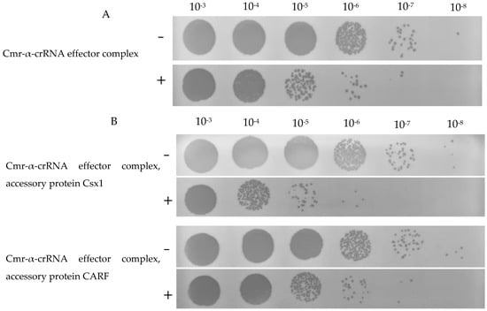 The plasmids pCDF Cmr-α, pACYC T4-34, or pET Csx1/CARF were transformed into E. coli BL21 (DE3), generating three types of transformants with different combinations: (1) pCDF Cmr-α and pACYC T4-34, (2) pCDF Cmr-α, pACYC T4-34, and pET Csx1, and (3) pCDF Cmr-α, pACYC T4-34, and pET CARF. The transformants containing (1) pCDF Cmr-α and pACYC T4-34 were able to express the Cmr-α-crRNA effector complex from the Cluster 4 CRISPR-Cas system. The transformants containing (2) pCDF Cmr-α, pACYC T4-34, and pET Csx1, as well as (3) pCDF Cmr-α, pACYC T4-34, and pET CARF, were capable of simultaneously expressing both the Cmr-α-crRNA effector complex and the effector proteins Csx1 or CARF (Figure S1).