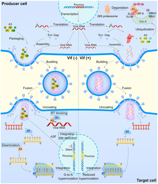 Acquired immunodeficiency syndrome (AIDS) was first identified in 1981, and its causative agent, HIV-1, was confirmed in 1983. HIV-1 infection triggers the expression of host RFs and upregulates IFN-stimulated genes, including the A3 proteins (reviewed in [104,105,147]). A3 protein expression confers innate immune responses by inducing hypermutation of the viral genome, causing potentially lethal changes to the virus and further restricting infection. However, HIV-1 has developed a mechanism to evade this defense: the Vif protein recruits host cofactors to ubiquitinate A3 proteins for degradation, neutralizing this defense mechanism (reviewed in [2,18,23,34,42]). Although structural characteristics and cellular factors regulate the enzymatic activity of A3 proteins (refer to Section 3), this section discusses the interaction of A3 proteins with HIV-1, which determines HIV-1 infection outcomes.