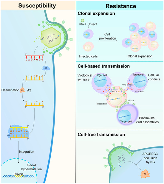 Human T-cell leukemia virus type 1 (HTLV-1), another retrovirus, is also targeted by A3 proteins. Although HIV-1 and HTLV-1 share similar replication cycles, HTLV-1 spreads primarily through the clonal expansion of infected cells rather than via the production and release of new virions, thereby reducing exposure to A3-mediated antiviral effects (Figure 3) (reviewed in [43,44,45]). Consequently, the selective pressure exerted by A3 proteins on HTLV-1 differs markedly from that on HIV-1. This review explores the mechanisms through which A3 proteins antagonize HIV-1 and HTLV-1, along with the countermeasures these viruses employ to evade A3 protein activity, ultimately shaping infection outcomes.