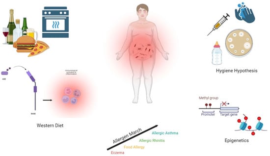 Western diets also include cooking food at higher temperatures, which is thought to play a role in the allergic response []. For example, in China, peanut consumption is like that of the United States, but the allergy rate is much lower. In China, peanuts are boiled, while in the United States, peanuts are roasted; therefore, it is thought that boiling may reduce the amount of allergen exposure. This highlights the false alarm hypothesis, whereby some foods, typically high in glucose, fat, and protein, when cooked in different ways, create specific products that mimic alarmins [,]. Advanced glycation-end products (AGEs), also called glycotoxins, are present when animal proteins and fats are cooked at high temperatures and expose amino acid chains that bind sugars. These alarmins can bind to their receptors, RAGE (receptor for advanced glycation end-products), which are highly expressed on dendritic cells, macrophages, T cells, and B cells. This RAGE activation results in downstream inflammation and promotes an adaptive immune response. Food allergy is therefore associated with these AGEs and proglycating dietary sugars which are priming innate signaling and causing allergy and inflammation [,]. In all, this demonstrates that the Western diet is a large contributor to the development of allergies.