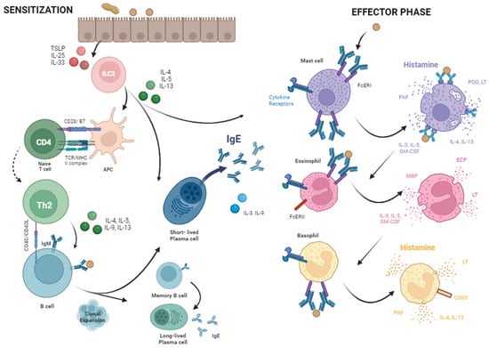 Mast cells are innate immune white blood cells that circulate in the blood and are home to tissues upon maturation, becoming tissue-resident cells [,]. As with B cells, mast cells phenotypes are altered by IL-4 and IL-5, largely through receptor expression, proliferation, and activation. Encounter with the specific antigen during re-exposure induces the cross-linking of IgE on the surface of these sensitized cells. This results in mast cell activation and degranulation within minutes, and the release of the pre-made proinflammatory mediators from the cells following fusion of their granules with the cell membrane [,].