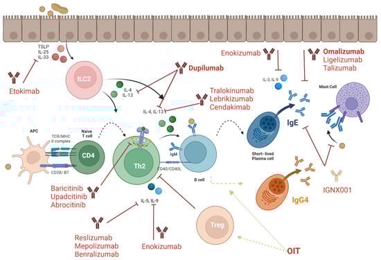 Beyond blocking IgE from binding its receptors on immune cells, biologics have begun to target proinflammatory cytokine receptors and cytokines that are secreted and mediate the allergic immune response including IL-4, IL-13, and IL-5. Anti-IL-4Rꭤ human IgG4 monoclonal antibody Dupilumab (Dupixent) has emerged as a successful therapeutic strategy, as IL-4R is an attractive target for intervening in severe and chronic allergic responses [,]. IL-4 and IL-13 secretion and subsequent binding to their receptor, as described above, plays a major role in the development of the Th2 immune response and driving the pathogenesis of allergy. There are two types of IL-4 receptors (IL-4R), both composed of two subunits, but that share the IL-4Rꭤ. The Type I IL-4R is composed of IL-4R heterodimers, ꭤ and ϒc, that bind to IL-4 []. The Type II IL-4R is composed of IL-4Rꭤ and IL-13Rꭤ1 that binds to both IL-4 and IL-13. Binding of these Th2-inducing cytokines triggers a signal transduction cascade, resulting in phosphorylation events of JAK kinases and downstream pathways, including STAT6, PI3k/Akt, and MAPK, and subsequent GATA-3 transcription factor binding and further promoting of IL-4 production []. Dupilumab targets the IL-4R complexes by inhibiting the dimerization of the IL-4Rꭤ chain to ϒc or IL-13Rꭤ1 and/or inhibiting IL-4 binding to its receptor. As described above, IL-4 can affect multiple cell types in the allergic response, including ILC2, DC, T, and B cells. Therefore, Dupilumab can prevent B cell activation and IgE secretion and downstream propagation of the allergic response [,]. Dupilumab was the first FDA-approved biologic for eosinophilic esophagitis, and in combination with omalizumab, it has been investigated for blocking both IgE and IL-4/IL-13 and is also being investigated as both monotherapy and as an adjunct with OIT for food allergy [,,].