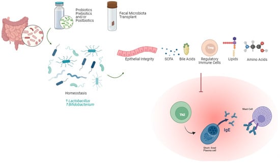 Probiotics are beneficial microorganisms that can colonize the gut and improve homeostasis and, hence, promote the beneficial effects of the normal flora. Through changing the normal flora structure upon colonization, probiotics can both antagonize harmful bacteria and affect the metabolism of the beneficial normal flora bacteria (Figure 6). Clostridia and Bifidobacterium gut microorganisms can attenuate allergic responses by promoting Breg or Treg cells that inhibit Th2 CD4+ T cells, or by inhibiting the allergen absorption [,,,,]. Additionally, Lactobacillus species has demonstrated usefulness as a supplementation for OIT, sustaining desensitization [,,,]. Further, gut flora dominance of Firmicutes, Ruminococcaceae, and Lachnospiracaea is evident in infants with allergies []. This highlights the overall reduction in microorganism diversity seen in children with various food allergies. Through metabolism modulation by prebiotics, it is possible to affect the production of bile acids, short-chain fatty acids, lipids, and amino acids []. Largely, downstream effects include modulation of the Th1/Th2 balance and mitigation of the immune-cell-mediated inflammation that would otherwise occur. This also results in improved epithelial barrier function, which can prevent an inflammatory response.