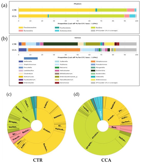 The taxonomic composition of bile microbial communities at the phylum and genus levels was analyzed and compared between the benign biliary diseases as a control (CTR) group and the cholangiocarcinoma (CCA) group. Stacked bar charts illustrate the taxonomic composition at the phylum level (a) and genus level (b). The term “ETC” (et cetera) represents the population of identified phyla or genera present at a proportion of less than 1%. At the genus level, the taxonomic profiling reveals that 1% of the composition of the higher taxonomic ranks remains unassigned, whereas no unassigned taxa were identified at the phylum level. The x-axis in the charts represents the relative abundance as a percentage. Double pie charts further depict the taxonomic compositions at the phylum level (inner circle) and genus level (outer circle) of the CTR group (c) and the CCA group (d).