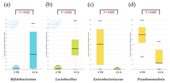A comparative analysis was conducted on the taxonomic composition of four selected taxa known for their significance in the human gastrointestinal tract. The benign biliary diseases as a control (CTR) group, consisting of patients with gallstones or gallbladder polyps, exhibited a lower relative abundance of Bifidobacterium (a) and Lactobacillus (b) compared to the cholangiocarcinoma (CCA) group. Conversely, the CTR group demonstrated a higher relative abundance of Enterobacteriaceae (c) and Pseudomonadota (d) relative to the CCA group.