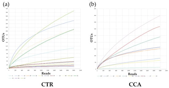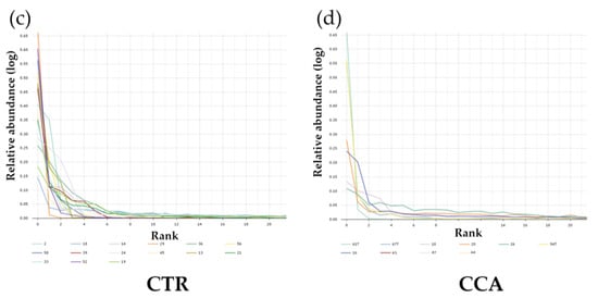 Species richness and diversity in the CTR and CCA groups were assessed through the generation of rarefaction curves based on sequence counts from each sample. The rarefaction curves for both groups plateaued, as observed in the CTR group (Figure 3a) and the CCA group (Figure 3b), indicating that a sequencing depth of 2000 was sufficient to accurately estimate species richness and diversity within each sample. Rank abundance curves were also utilized to compare the microbial community structures of the two groups. The distinct patterns in the curves for the CTR group (Figure 3c) and the CCA group (Figure 3d) suggest notable differences in their microbial community structures.