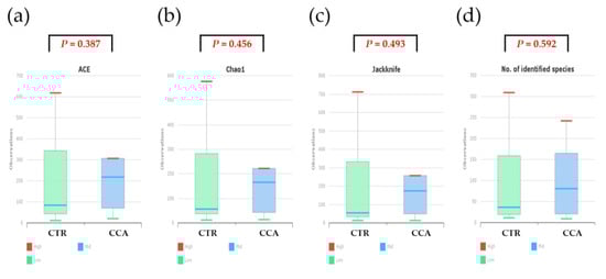 The alpha diversity of bile microbial communities at the genus level was analyzed for the benign biliary diseases as a control (CTR) group, consisting of patients with gallstones or gallbladder polyps, and the cholangiocarcinoma (CCA) group using massively parallel 16S rRNA gene sequencing. Alpha diversity was evaluated in terms of species richness (a–d) and diversity indices (e–h) within bile microbial communities collected from the common bile duct in the CTR group and the gallbladder in the CCA group. The red lines indicate high values, the blue lines represent median values, and the green lines show low values.