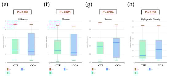 Alpha diversity was analyzed using indices such as Jackknife, Chao1, and ACE to evaluate variations in the bile microbial communities of the two groups. The analysis revealed that the bacterial diversity in bile samples was lower in the CTR group compared to the CCA group, although the differences were not statistically significant (Figure 4a–c). When normalized to a consistent read count based on gene copy numbers, alpha diversity, as measured by species richness, remained lower in the CTR group than in the CCA group, but the difference was not statistically significant (Wilcoxon rank-sum test, p = 0.592; Figure 4d). Further analysis of alpha diversity indices, including NPShannon (p = 0.788), Shannon (p = 0.835), Simpson (p = 0.976), and phylogenetic diversity (p = 0.633), also showed no statistically significant differences between the two groups (Figure 4e–h).