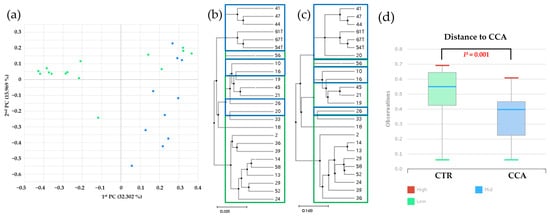 Beta diversity within bile microbial communities at the genus level was assessed for the benign biliary diseases as a control (CTR) group, consisting of patients with gallstones or gallbladder polyps, and the cholangiocarcinoma (CCA) group using massively parallel 16S rRNA gene sequencing. (a) A principal coordinate analysis (PCoA) revealed distinct clustering patterns, indicating differences in overall bile microbial community composition between the CTR group (solid green dots) and the CCA group (solid blue dots) based on gallstone location. A hierarchical clustering analysis, performed using the unweighted pair group method with arithmetic mean (UPGMA), demonstrated variations in microbial abundance and diversity between the CTR group (empty green boxes) and the CCA group (empty blue boxes), based on generalized UniFrac (b) and UniFrac (c) metrics. (d) Differences in diversity indices between the CTR and CCA groups were quantified and presented in representative box plots using permutational multivariate analysis of variance (PERMANOVA). The red lines indicate high values, the blue lines represent median values, and the green lines signify low values.