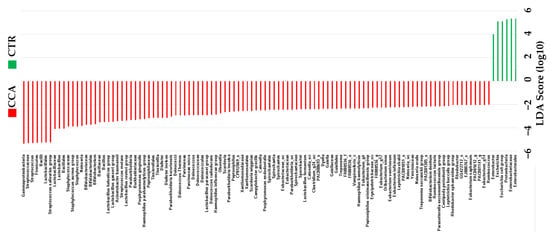 The taxonomic distribution within the benign biliary diseases as a control (CTR) group, consisting of patients with gallstones or gallbladder polyps, and the cholangiocarcinoma (CCA) group was analyzed using the linear discriminant analysis effect size (LEfSe). The analysis was performed with a linear discriminant analysis (LDA) score threshold > 3 and the Kruskal–Wallis test set at a significance level of 0.05.