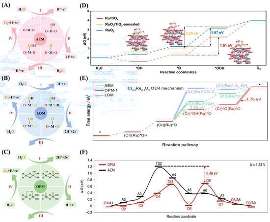 Schematic illustration of AEM (A), LOM (B), and OPM (C) in the OER process. (The symbol “( )” represents oxygen vacancies and M stands for metal). (D) Gibbs free energy diagram of the OER on Ru/TiOx, RuO2, and RuO2/TiO2-annealed. (The symbol “*” represents adsorption sites or active sites on the catalyst surface.) (D) was reproduced with permission [33]. Copyright 2025, American Chemical Society. (E) Free energy diagrams for OER paths on the surfaces of Cr0.6Ru0.4O2. (E) was reproduced with permission [34]. Copyright 2024, American Chemical Society. (F) The free energy (ΔG) diagrams of AEM and OPM at 1.23 V versus RHE. (F) was reproduced with permission [35]. Copyright 2021, Nature Publishing Group.