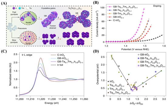(A) The schematic routes for synthesizing GB-Ta0.1Tm0.1Ir0.8O2−δ nanocatalyst. (B) LSV curves of different doped GB-TaxTmyIr1−x−yO2−δ samples versus C-IrO2. (C) Ir L-edge XANES spectra for Ir foil, C-IrO2, GB-IrO2−δ and GB-Ta0.1Tm0.1Ir0.8O2−δ nanocatalysts. (D) The volcano plot for the overpotential as a function of ΔGO − ΔGOH for various TaxTmyIr1−x−yO2−δ catalyst models through doping and strain effects. (A–D) were reproduced with permission [27]. Copyright 2021, Nature Publishing Group.