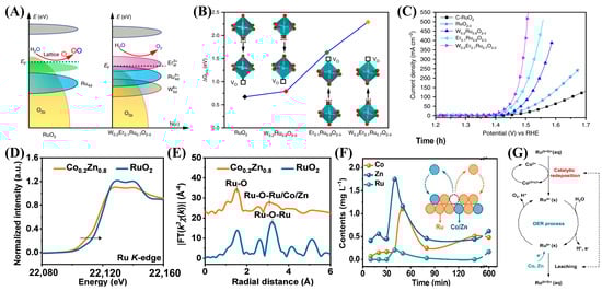 (A) Schematic diagrams of rigid band models for RuO2 and W0.2Er0.1Ru0.7O2−δ−1. (B) The calculated energy for formation of VO in different positions of RuO2, W0.2Ru0.8O2−δ−1, Er0.1Ru0.9O2−δ−1, and W0.2Er0.1Ru0.7O2−δ−1. (C) Polarization curves. (A–C) were reproduced with permission [24]. Copyright 2020, Nature Publishing Group. (D) Ru k-edge XANES spectra and (E) Fourier transforms of k3-weighted EXAFS signals of RuO2 and Co0.2Zn0.8@RuO2 after OER measurement. (F) ICP contents of Co, Zn, and Ru in electrolyte. (G) Self-catalyzed redeposition mechanism of Co0.2Zn0.8@RuO2. (D–G) were reproduced with permission [69]. Copyright 2024, American Chemical Society.