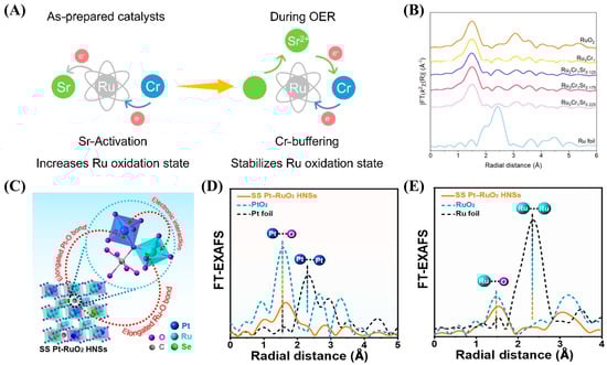 (A) Schematic diagram of the effects of incorporating Sr and Cr. (B) FT-EXAFS spectra at the Ru Kedge of as-prepared Ru3Cr1Srx catalysts, standard Ru foil, and RuO2. (A,B) were reproduced with permission [30]. Copyright 2024, American Chemical Society. (C) Structural illustration of SS PtRuO2 HNSs. (D) Pt L3-edge EXAFS spectra of SS Pt-RuO2 HNSs, PtO2, and Pt foil. (E) Ru Kedge EXAFS spectra of SS Pt-RuO2 HNSs, commercial RuO2, and Ru foil. (C–E) were reproduced with permission [72]. Copyright 2022, American Association for the Advancement of Science.