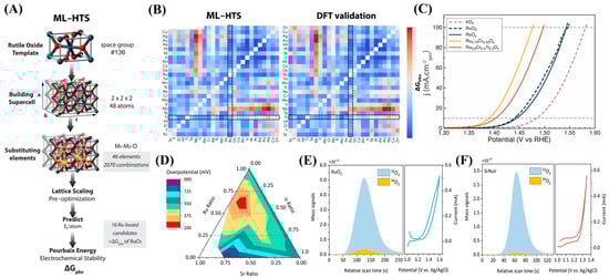 (A) Diagram illustrating the workflow of the machine learning high-throughput screening (ML-HTS) pipeline employed to predict the Pourbaix electrochemical stability (ΔGpbx) for 2070 rutile oxide structures. (B) CGCNN-HD heatmaps of ΔGpbx vs. DFT validation stability heatmap for the subset. Highlighted in the dashed area is Ru-Ti as the most stabilizing with a nonprecious metal. (C) Calculated OER overpotential with different ternary compositions. The three edges of the ternary plot correspond to the ratio of two metal elements (i.e., Ir-Sr, Ir-Ru, and Sr-Ru). (A–C) were reproduced with permission [31]. Copyright 2024, American Chemical Society. (D) Schematic diagram of the effects of incorporating Sr and Cr. (E,F) DEMS signals of 32O2 (16O16O) and 34O2 (16O18O) from the reaction products for 18O-labeled SrRuIr and RuO2 catalysts in H218O aqueous sulfuric acid electrolyte and corresponding CV cycles. (D–F) were reproduced with permission [25]. Copyright 2021, American Chemical Society.