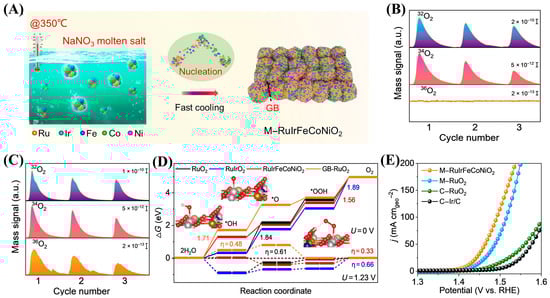 A further step beyond the dual-doping strategy is to construct high-entropy oxides based on RuO2 or IrO2. For example, Huang et al. proposed a design strategy for multicomponent catalysts to address the issues of poor stability and limited catalytic activity of RuO2 under acidic OER conditions. The authors incorporated both acid-resistant components (Ir) and activity-enhancing components (Fe, Co, Ni) into RuO2 and prepared a five-element high-entropy oxide (M-RuIrFeCoNiO2) rich in GB through a rapid and non-equilibrium method (Figure 6A) [75]. Microscopic analysis, DFT, and DEMS with isotope labeling indicate that the incorporation of exogenous metal elements and GB can effectively alter the electronic structure and OER pathway of RuO2, inhibit the participation of lattice oxygen in the OER process, and thus improve its activity and stability (Figure 6B,C). Meanwhile, the synergistic effect of multiple exogenous metal elements with GB can regulate the binding energy of oxygen intermediates and accelerate the reaction kinetics of OERs. Therefore, the OER overpotential required for the prepared M-RuIrFeCoNiO2 catalyst to reach a current density of 10 mA/cm2 is only 189 mV (Figure 6D,E). The authors combine the advantages of various components and GB, breaking through the limitations of thermodynamic solubility of different metal elements.