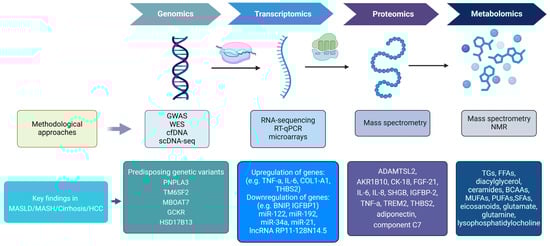 Omics technologies are high-throughput technologies that have been applied for the identification of biomarkers, the characterization of biochemical reactions, and the clarification of many pathophysiological processes []. These non-invasive diagnostic modalities offer a new tool to better comprehend the distinct stages of NAFLD and can be used for the discovery of new treatments. The most common omics technologies applied in NAFLD research include genomics, transcriptomics, proteomics, and metabolomics. These techniques can contribute to better understanding, diagnosing, and treating NAFLD. Indeed, omics technologies are expected to bring us a step closer to better understanding the pathophysiology of NAFLD and further discovering non-invasive methods for the diagnosis of the disease, the recognition of its different stages, and the identification of therapeutic targets []. For example, various omics technologies applied in in vitro NAFLD models provide further insights into the underlying mechanisms of NAFLD, which may facilitate the discovery of biomarkers for the diagnosis of the disease, as well as the development of novel drugs against NAFLD []. Figure 2 depicts the main methodologies, and key findings in MASLD, MASH, cirrhosis, and HCC.