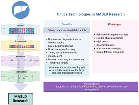 Advancements in Omics Technologies for MASLD Research: Methodologies and Key Findings in MASLD, MASH, Cirrhosis and HCC. Created in BioRender, https://BioRender.com/y12y360 (accessed on 12 February 2025).