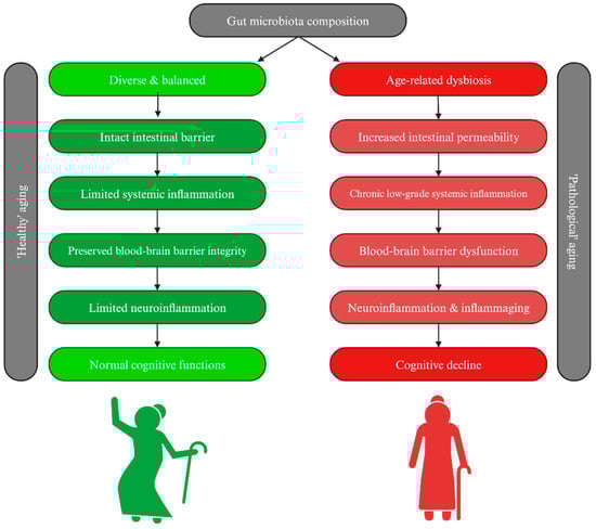 A study by Qi et al. comparing two cohorts of healthy adults differentiated by age showed that compared to the younger cohort, adults over 70 years of age had significantly elevated levels of zonulin, a marker of increased intestinal permeability, and of high-mobility group box protein, which triggers inflammation []. Additionally, an animal-based study by Thevaranjan et al. demonstrated that under germ-free conditions, mice did not exhibit an age-related increase in pro-inflammatory cytokine concentrations []. This suggests that age-related dysbiosis may be the triggering factor for the inflammatory response and its subsequent consequences []. Figure 1 illustrates a flowchart showing how gut microbiota composition, whether healthy or pathological dysbiosis, may affect the aging process.