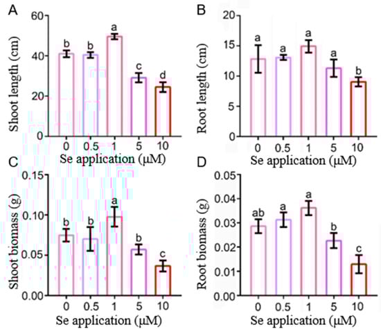 Effects of different Se concentration on the growth parameters of rice seedlings. (A) Shoot length, (B) root length, (C) shoot biomass, and (D) root biomass of rice seedlings under different Se treatments. Seedlings (14 d old) of the rice were grown hydroponically in nutrient rich solution and then under 0, 0.5, 1, 5 and 10 μM Se treatments for 14 d, respectively. Data are represented as the mean ± standard deviation (SD). Different letters indicate significant differences under different Se treatments (p < 0.05, Student’s t-test).