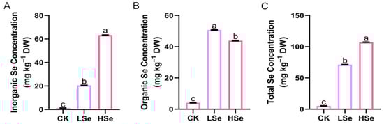 To investigate the effect of different Se concentrations on the Se content in rice seedlings, the total Se content in the seedlings was quantified (Figure 2A). The results revealed that Se application significantly enhanced the total Se content in the rice seedlings. The total Se content in the seedlings under the HSe treatment peaked at 1.51 times that of the LSe treatment and 17.83 times that of the CK treatment. Additionally, the inorganic and organic Se contents in the rice seedlings were also measured. The results indicated that both LSe and HSe treatments significantly elevated the inorganic Se content in the seedlings relative to the CK, with the most pronounced increase observed under the HSe treatment (Figure 2B). Moreover, Se application significantly increased the organic Se content in the rice seedlings, with the highest content observed under the LSe treatment, which was 1.16 times greater than that observed under the HSe treatment (Figure 2C).