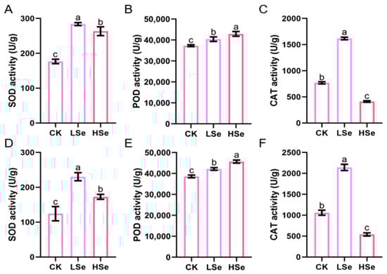 Effects of different Se concentration on the antioxidant enzyme activities of rice seedlings. (A,D) SOD activity, (B,E) POD activity, (C,F) CAT activity of rice seedlings under different Se treatments. (A–C) shows shoot data; (D–F) shows root data. Seedlings (14 d old) of the rice were grown hydroponically in nutrient rich solution and then under 0, 1, and 10 μM Se treatments for 14 d, respectively. Data are represented as the mean ± standard deviation (SD). Different letters indicate significant differences under different Se treatments (p < 0.05, Student’s t-test).